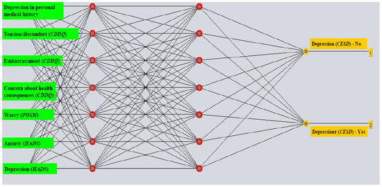 Methods of descriptive statistics were used to present categorical variables as absolute numbers and frequencies, and the chi-squared test was used to compare these variables. The ANN model that was used in this study was the multilayered perceptron, which uses a supervised learning technique algorithm carried out through feedforward back-propagation. The investigated outcomes were absence or presence of pre-diagnostic and post-diagnostic depression (labeled as 1 for CES-D scores < 16 and labeled as 2 for CES-D scores ≥ 16). Entry variables were sociodemographic and epidemiological characteristics of participants. Feature selection was performed using the filter method of correlation-based attribute selection, alongside the ranker search method. Variables that contribute most to the prediction model were chosen by estimating the Pearson correlation between the attribute and the class. The dataset was split using the unsupervised resample filter in order to create random dataset subsamples of 60% of the dataset for training, 20% for validation, and 20% for testing (external validation). The 10-fold cross-validation with “trial & error” method was used to construct the model and select the best parameters. The confusion matrix and kappa statistic were used to evaluate models. Accuracy, rate of false positive and rate of false negative outcomes, precision, ROC curve, and Matthews correlation coefficient were indicators of model performance. TRIPOD+AI guidelines were followed (Table S1). All statistical analyses were carried out in SPSS (The Statistical Package for Social Sciences software, SPSS Inc, version 20.0, Chicago, IL, USA), while the model building was performed using the Waikato Environment for Knowledge Analysis program (Weka, version 3.8.0, Waikato, New Zealand). Statistical significance was considered for p-values < 0.05.