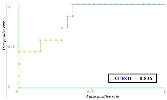 Prediction of post-diagnostic depression in women with a positive Pap screening test employed an ANN model (with all attributes) with a learning rate of 0.6, a momentum of 0.3, 1000 epochs, and two hidden layers, with half of the sum of attributes and classes as the number of neurons in one hidden layer, and the sum of attributes and classes as the number of neurons in the other hidden layer. For the model with selected attributes, the parameters were: a learning rate of 0.6, a momentum of 0.1, 1000 epochs, and two hidden layers, each with 7 neurons (Figure 3). The selection of the most important features involved the HADS depression score, HADS anxiety score, POSM Worry score, CDDQ score for concern about health consequences, CDDQ score for Tension/discomfort, depression in personal medical history, and CDDQ score for Embarrassment (Table 2). The post-diagnostics depression prediction model showed a sensitivity and a specificity of 70.6% and 72.2%, respectively (Table 4). An area under the ROC curve score of 0.836 indicated that the created model is a good classifier (Figure 4).