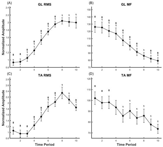 4.1. EMG Time Domain Changes in the Agonist GL and Antagonist TA Muscles