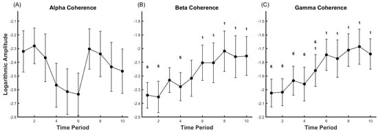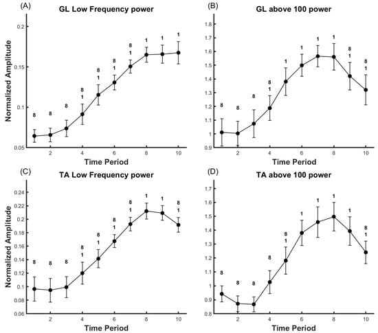 - Low frequency band (8–60 Hz): Compared to the onset of the motion, power significantly increased at time points T4 through T10 (p < 0.05). However, significant power decrease was observed at T10 when compared to T8 (p < 0.05).