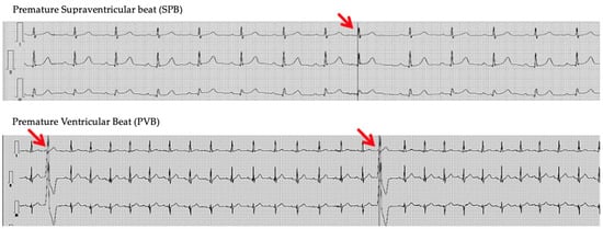 Typical ECG recordings of SPB and PVB found in our study group (indicated by the arrow).