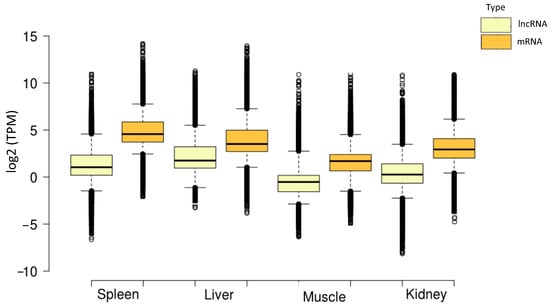 A total of 21,932 high confidence lncRNAs were identified in blue sharks, with a length ranging from 201 to 9311 bp (median and average lengths of 611 and 885 bp, respectively) (Supplementary Table S3). This number of lncRNAs is substantially higher than those previously reported for the whitespotted bamboo shark [23] and Australian ghostshark (Callorhinchus milii) [22], although the distributions of sequence lengths were comparable. The comparison with available ncRNA sequences of several shark species (i.e., white shark, whitespotted bamboo shark, whale shark, small-spotted catshark, and zebra shark) revealed that the majority of lncRNAs in blue shark (N = 21,920) are novel and have not previously been documented in any of these other shark species (Supplementary Table S4). The lengths of the lncRNAs sequences identified in blue sharks were shorter than the annotated protein-coding genes (median and average lengths of 754 and 987 bp, respectively), with a slightly higher GC content for protein-coding genes (46.34%) compared to lncRNAs (42.58%). Notably, lncRNAs in blue sharks demonstrated lower expression levels than protein-coding genes in all the tissues analyzed (Figure 1). Further, two lncRNAs in blue sharks were identified as potential precursors of two known miRNAs (TRINITY_DN10569_c4_g1: Oryzias latipes-mir-181b-1 and TRINITY_DN11922_c0_g4: Homo sapiens-miR-1244-4).