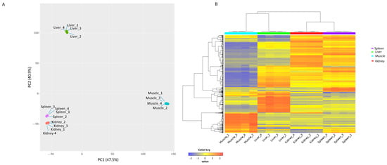 To categorize the global expression patterns of the lncRNAs identified among tissues, a principal component analysis (PCA) (RNA-seq data normalized to relative log estimate) and heatmap (RNA seq data normalized to TPM) analyses were utilized. The four tissue types from blue sharks were distinctly clustered in the heatmap analysis in the first and second principal components (PC1 and PC2), explaining 88.4% of the variance (Figure 2).