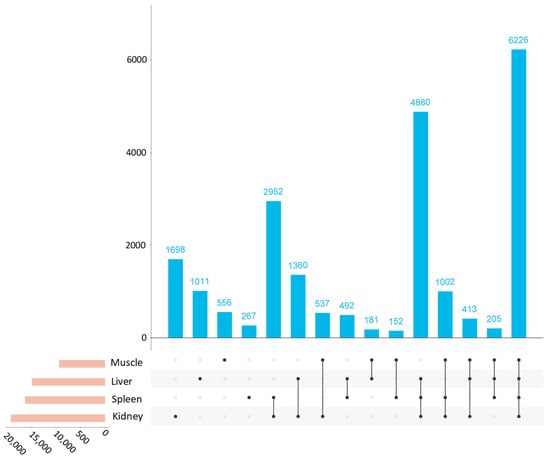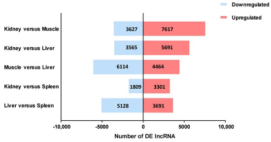 A mean number of 14,821 lncRNAs were observed per tissue type, with only 6226 shared among all tissues (Figure 3). Most of the lncRNAs identified were expressed (TPM ≥1) in the liver (14,768), spleen (16,176), and kidney (19,068), while muscle showed the smallest number (9272). The kidney and spleen, key lymphoid organs in sharks, share a close pattern of lncRNA expression. A total of 45,007 DE lncRNAs were obtained between pairwise tissue type comparisons, with the greatest and least number of DEs found among kidney vs. muscle and kidney vs. spleen, respectively (Figure 4) (Supplementary Table S5).
