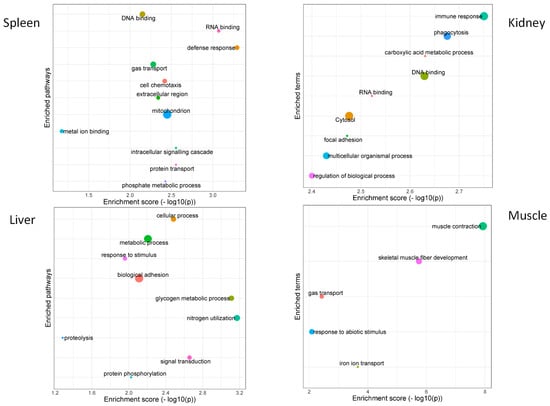 An analysis of the protein-coding target genes of the total DE lncRNAs detected 454 protein-coding genes as trans-regulated and targeted by 1001 lncRNAs. GO enrichment analysis of these target genes across tissues showed diverse, relevant biological process terms, such as muscle contraction (GO:0006936) and skeletal muscle fiber development (GO:0048741) in muscle tissues; phagocytosis (GO:0006909) and immune response (GO:0006955) in kidney tissues; glycogen metabolic process (GO:0005977), signal transduction (GO:0007165), and nitrogen utilization (GO:0019740) in liver tissues and defense response (GO:0006952), RNA binding (GO:0003723), and defense response (GO:0006952) in spleen tissues (Figure 5).