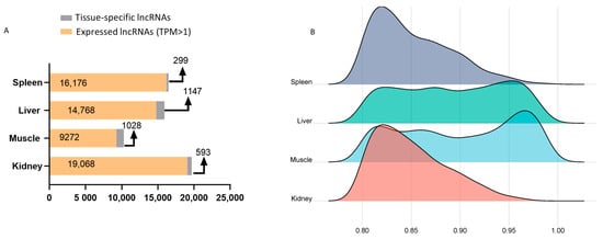 Using the PEM index, we found that liver (1147) and muscle (1028) tissues had the greatest numbers of TS lncRNAs, while kidney (593) and spleen (299) had the least. Further, a density plot of maximum-normalized PEM values shows similar patterns among the liver and muscle, as well as spleen and kidney tissues (Figure 6). In addition, a total of 8984 stably expressed lncRNAs were identified across all the tissues (Supplementary Table S6).