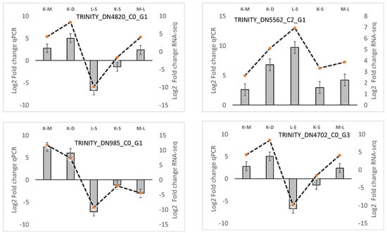 Validation of four lncRNAs in blue shark (Prionace glauca) using RT-qPCR. CT-qPCR raw data were analyzed using the 2−ΔΔCt method using beta-actin and TRINITY_DN16185_c1_g2 as reference genes. Each column represents the mean of qPCR technical replicates ±SE, and broken lines represent RNA-seq fold change tissue values.