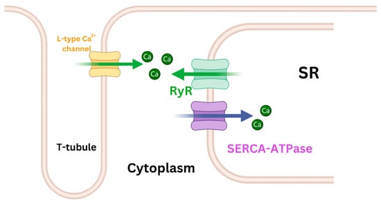 Simplified schematic diagram of Ca2+ regulation channels during the myocardial cell contraction and relaxation phases. The sarcoendoplasmic reticulum calcium ATPase (SERCA-ATPase) pump is vital for absorbing Ca2+ and storing it in the sarcoplasmic reticulum (SR). This absorption reduces the Ca2+ concentration in cytoplasm, contributing to the initiation of the myocyte’s relaxation phase. Importantly, SERCA-ATPase remains active throughout the relaxation process. In parallel, ryanodine receptors (RyR), stimulated by external Ca2+ from L-type Ca2+ channels, release stored Ca2+ from the SR. This increases the concentration of Ca2+ in the cytoplasm, ultimately triggering myocyte contraction.
