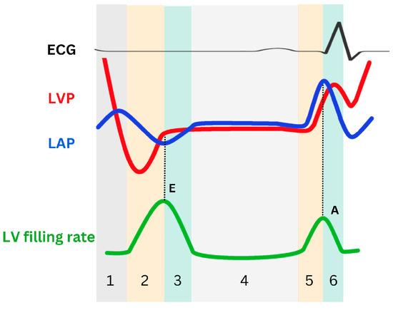 Schematic representation of left ventricular pressure (LVP), left atrial pressure (LAP), and LV filling rate during the relaxation phase. The cardiac cycle consists of six phases: isovolumetric relaxation (phase 1), LV active relaxation (early rapid filling in phase 2 and inflow deceleration in phase 3), diastasis (phase 4), and LA contraction (the A wave upstroke in phase 5 and the A wave downstroke in phase 6). The initial pressure crossover marks the conclusion of isovolumic relaxation and the commencement of early rapid filling. which begins with the opening of the mitral valve. During this phase, LAP surpasses LVP, hastening mitral flow, and peak mitral E aligns with the second crossover. Subsequently, LVP surpasses LAP, slowing mitral flow and demarcating the early rapid filling phase and inflow deceleration phase. These phases are succeeded by diastasis, characterized by minimal pressure differentials. During LA contraction, LAP once again surpasses LVP, and an A wave appears. E: mitral peak velocity of early filling; A: mitral peak velocity of late filling.