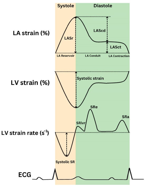 Schematic representation of left ventricular (LV) strain, strain rate, and left atrial (LA) strain (LAS). SRivr: strain rate during isovolumic relaxation; SRe: strain rate during early diastole; SRa: diastolic peak longitudinal strain rate; ECG: electrocardiogram.