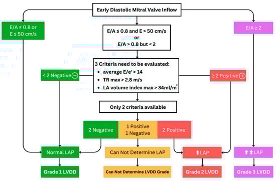 The differentiation between normal and abnormal diastolic function is complicated by the overlap between Doppler indices in healthy individuals and those with LVDD [23]. Individual parameters, including E/e′ and others discussed above, are no more than moderately associated with filling pressures and are insufficient when used independently [40]. Therefore, evaluating diastolic function requires using an integrated approach with three parameters [23]. If two of the three variables meet the cutoff values, this indicates an elevated LAP and grade II LVDD. If only one of the three available variables (Figure 6, third row, center box) meets the cutoff value, LAP is considered normal, indicating grade I LVDD. If there is a 50% discordance between two or four available variables, the findings are considered inconclusive for estimating LAP. Estimating LAP is not recommended if only one parameter provides a satisfactory signal.