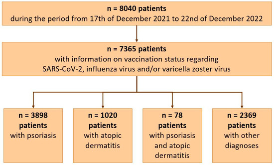 Out of 8040 patients, 7365 adult patients with information on vaccination status regarding SARS-CoV-2, influenza virus, and/or varicella zoster virus could be included in the analyses: 3898 patients with psoriasis, 1020 with atopic dermatitis, 78 with both diagnoses, and 2369 patients diagnosed with other dermatological diseases, like hidradenitis suppurativa, lupus, chronic autoinflammatory wounds, and various others (Figure 1). A total of 57.6/42.3% of patients were male/female (n = 4242/3119, n = 2 non-binary, n = 2 missing data), and 75.1% were aged 18–59 (n = 5528).