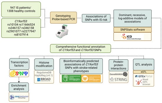 - The Cerebrovascular Disease Knowledge Portal (CDKP) (https://cd.hugeamp.org/ (accessed on 16 May 2024)) and Cardiovascular Disease Knowledge Portal (https://cvd.hugeamp.org/ (accessed on 16 May 2024)) integrate and analyze genetic association data from major consortia to study cardio- and cerebrovascular diseases, aiding in the exploration of associations between C19orf53 SNPs and atherosclerosis-related conditions and risk factors for IS (like low density lipids, body mass index, total cholesterol) [37].