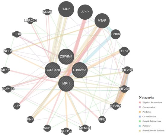 - Bioinformatic tool STRING database (https://string-db.org/ (accessed on 14 May 2024)) was employed to analyze the primary interaction partners of C19orf53. Additionally, the analysis of biological processes and molecular functions related to interactions with key functionally related proteins was conducted using the STRING database [33].
