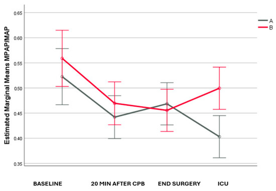 MPAP/MAP (Figure 2) values were similar between the two groups at baseline, 20 min after CPB discontinuation, as well as at the end of the surgery. However, two hours after surgery, MPAP/MAP in group A was lower than in group B (p = 0.002). Over time, in both groups, there was a significant decrease from baseline until 20 min after CPB discontinuation (p = 0.040 and p = 0.017, respectively). Furthermore, in group A, there was a significant decrease from the end of the surgery until two hours later (p = 0.008). The degree of change over time differed significantly between groups, with group A having a greater overall decline than group B (p = 0.017).