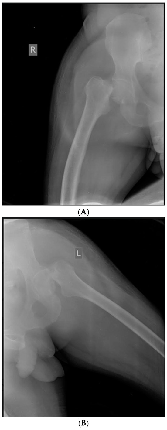 Case 1. Femoral neck fractures are common in the elderly population, who are frequently confronted with osteoporosis. Though rare, these fractures can also occur, mainly unilaterally, in younger individuals following a high-energy trauma. Only a few articles describe bilateral simultaneous femoral neck fractures as an injury resulting from seizures, and these were not assessed in PwH. We report a case of a bilateral femoral neck fracture in a 50-year-old male with severe haemophilia B (SHB) following a generalized convulsion. The patient was addressed to the emergency department for a generalized tonic-clonic seizure episode, and the patient was known and had been treated for epilepsy; he presented with evidence of SHB and multiple haemophilic arthropathies without a history of trauma or any comorbidities. On examination, the lower limbs were externally rotated; there were no distal neurovascular deficits, open wounds, or trauma evidence. Radiography revealed a bilateral femoral neck fracture (Figure 1A,B). Under rigorous hemostatic control, the orthopaedic surgeon team decided to intervene in one stage, and bilateral simultaneous hip arthroplasty was performed. The right hip joint was complicated with pertrochanteric fracture and needed additional osteosynthesis with screws (Figure 1C). Postoperatively, bedside hip range of motion exercises were started within days 2–3 after surgery, continuing with an enhanced rehabilitation program. The patient had a favourable outcome without any post-operative complications and was discharged after 30 days. Overall costs were EUR 86,856.05, and the factor concentrate accounted for 91.75% of expenditures (recombinant FIX, ~EUR 79,697.48). However, these two simultaneous major interventions had a decisive, favourable effect on the costs and rehabilitation of the patient. Due to a forceful contraction of muscles during an episode of generalised tonic-clonic seizures, a fracture or dislocation may develop.