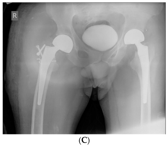 (A) Case 1—X-ray: Right femoral neck fracture—before surgery. (B) Case 1—X-ray: Left femoral neck fracture—before surgery. (C) Case 1—X-ray: Bilateral simultaneous hip arthroplasty, the right hip joint was complicated with pertrochanteric fracture and needed additional osteosynthesis with screws.