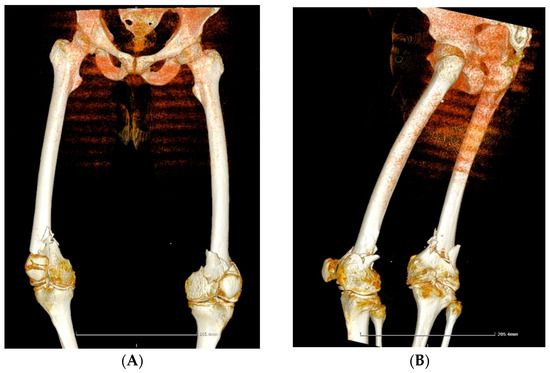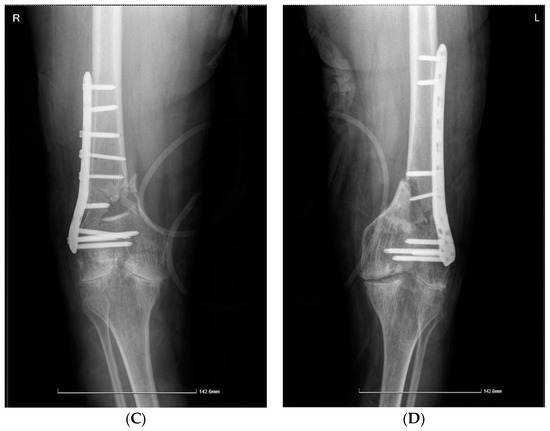 (A,B) Case 2—Computed tomography image: bilateral femoral supracondylar comminuted fracture. (C,D) Case 2—X-ray of right and left femur and knee. Open post-reduction status and internal fixation with present osteosynthesis material (plate with screws) at the level of the diaphysis and distal femoral epiphysis, following a femoral supracondylar comminuted fracture.