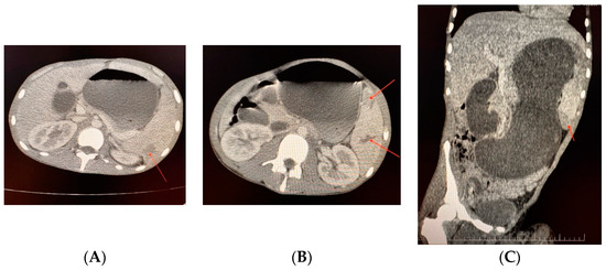 (A–C) Case 3—Abdomen and pelvis computed tomography scan with contrast (anteroposteriorly and sagittal view). Hepatosplenomegaly. Right liver lobe of 20 cm, left liver lobe at the axillary line. The kidneys and pancreas were normal. Gastric dilatation. Spleen enlarged 15/6/19 cm, with mid-body capsular fissure, two hypo-capturing areas at the inferior pole (9/2/3 cm) and posterior median region (3/3 cm), and subcapsular hematoma. Without abdominal-pelvic collections.