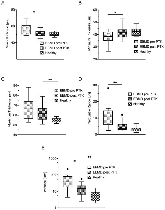 Terms of mean (A), minimum (B) and maximum (C) epithelial thickness as well as interquartile range (D) and variance (E) of epithelial thickness. The reduction of IQR after PTK showed the highest significance, followed by variance, mean thickness, and minimum thickness. The maximum epithelial thickness did not show a statistically significant decrease after PTK. * p < 0.05; ** p < 0.01; EBMD, epithelial basement membrane dystrophy; PTK, phototherapeutic keratectomy.