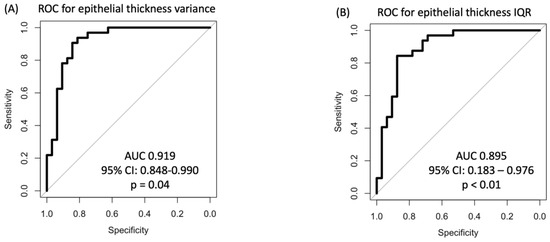 ROC analyses of (A) the variance of epithelial thickness and (B) the IQR show a high capacity for discrimination between healthy and EBMD corneas. AUC, area under the curve; EBMD, epithelial basement membrane dystrophy; IQR, interquartile range; ROC, receiver operating characteristic.