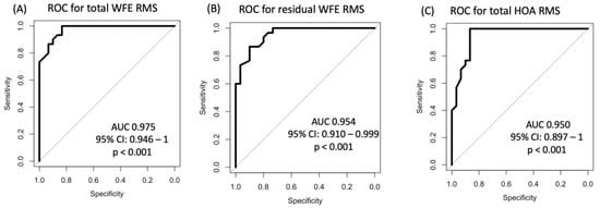 ROC analyses of the wavefront errors between healthy individuals and EBMD patients prove an even higher discriminatory power compared to Figure 2. The highest AUC was achieved for analysis of the total WFE RMS (A), followed by the residual WFE RMS (B) and total HOA RMS (C). ROC, receiver operating characteristic; WFE, wave front error; EBMD, epithelial basement membrane dystrophy; HOA, higher order aberrations.