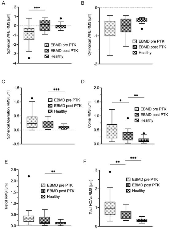 Corneal epithelial aberrometry. Displayed are lower-order aberrations spherical WFE (A) und cylindrical WFE (B) and higher-order aberrations spherical aberration (C), coma (D), trefoil (E) and total HOA (F) in EBMD patients before and after PTK, as well as in a healthy control group. * p < 0.05; ** p < 0.01; *** p < 0.001; WFE, wavefront error; EBMD, epithelial basement membrane dystrophy; PTK, phototherapeutic keratectomy; RMS, root mean square.