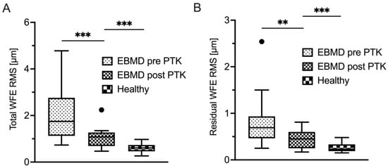 Corneal epithelial aberrometry—summative terms. Displayed are the total WFE (A), as well as residual WFE (B), in EBMD patients before and after PTK as well as in a healthy control group. * p < 0.05; ** p < 0.01; *** p < 0.001; WFE, wavefront error; EBMD, epithelial basement membrane dystrophy; PTK, phototherapeutic keratectomy; RMS, root mean square.
