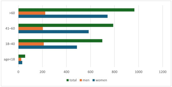 In the years 2019–2024, 2508 people with a suspicion of demodicosis were admitted to the Mycology Outpatient Clinic of the University Clinical Centre in Gdańsk. Of this group, 1846 (74%) people were women, while 662 (26%) were men. The average age of patients was 51.9 years, with an average of 52.6 years for women, and for men 50.0 years. Detailed data on the age of patients are presented in Figure 1.
