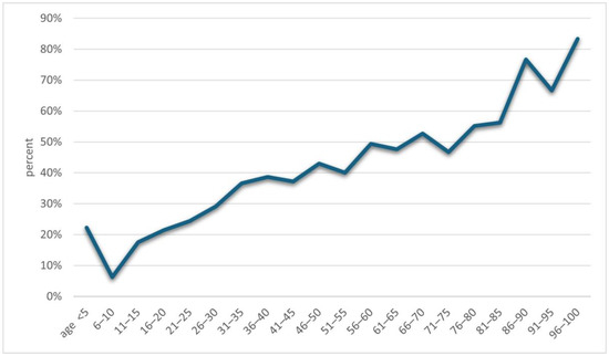 Another issue that has already appeared in previous publications and which is confirmed by this study is the positive correlation of the occurrence of Demodex spp. with age—the higher the age of the patient, the higher the probability of being infected with this mite [2,3,4,5,6,15,16,17]. During the analysis, it was shown that the age group in which patients are most at risk for the presence of Demodex spp. is people over 60 years of age (Figure 2), among whom 58.65% received a positive test result (Table 2). In turn, in the group of minors, i.e., under 18 years of age, the occurrence of infestation was confirmed in only 14.29% of people. The correlation between age and the frequency of Demodex spp. presence confirmation in a given patient is shown in Figure 3. As can be seen, this relationship is especially true for age groups above 15 years of age. This may be related to the small number of patients below this age, which makes it difficult to statistically adequately represent a given population.