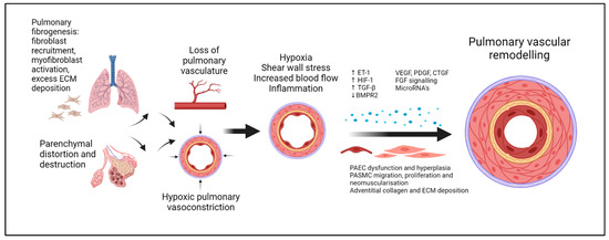 Pro-fibrotic growth factors such as platelet-derived growth factor (PDGF), connective tissue growth factor (CTGF), and insulin-like growth factor (IGF-1) contribute to both parenchymal fibrosis and vascular remodelling [71]. Similarly, fibroblast growth factor (FGF) signalling affects PAECs, promotes PASMC proliferation [72] and has been observed to increase alongside HIF-1α, suggesting a likely role in hypoxic PH [73].