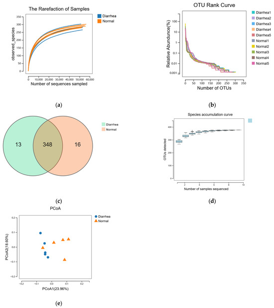 Comparative analysis of the fecal microbiome structure. The rarefaction curves (a) and rank abundance curves (b) were used to estimate the alpha diversity of the fecal microbiota in healthy and diarrheic calves. (c) Venn diagram illustrating the common and exclusive OTUs in the fecal microbiota of the two groups. (d) Species accumulation curve. The x-axis shows the number of samples and the y-axis shows the number of OTUs. The species accumulation curve reflects the influence of sampling number on species diversity. (e) Principal Co-ordinate Analysis based on the relative abundance of OTUs with Bray–Curtis distances, showing the differences between each individual calf. Normal, healthy calf, n = 5; diarrhea, diarrheic calf, n = 5.