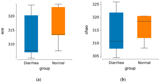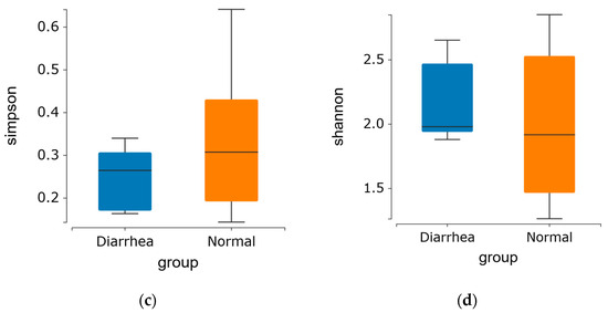 Alpha diversity index of the fecal microbiome in healthy and diarrheic calves. (a) Ace and (b) Chao1 indices represent OTU richness within the samples. (c) Shannon and (d) Simpson indices indicate the diversity of OTUs in the samples.