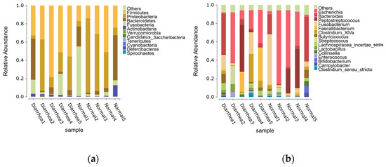 Histogram of relative abundance: (a) phyla with relative abundance greater than 0.5% and (b) genera with relative abundance greater than 0.5%. The x-axis shows the sample name and the y-axis shows the relative abundance of the species. Species with a relative abundance of less than 0.5% were combined as “Others”.