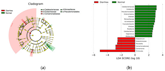LefSe analysis. (a) The cladogram diagram. The same color indicates different groups, and nodes in different colors indicate microbiomes that play an important role in the group represented by the color. A color circle represents a biomarker, and the legend in the upper right corner is the biomarker’s name. The yellow nodes represent microbial groups that do not play an important role in the different groups. From the inside to the outside, each circle in turn is the phyla, class, order, family, and genus level species. (b) The LDA effect size plots. Green indicates healthy enriched genera and red indicates diarrhea enriched genera. Only the absolute value greater than 2 is plotted.