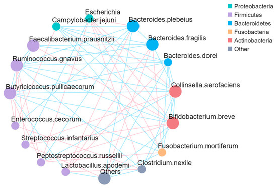 The network plot. Each node in the figure represents a species, and the color of the dots indicates that among these groups, the relative abundance of the group is the highest. The larger the area of the dots, the higher the average relative abundance of the species. Straight lines are used to connect species to species, with pink indicating a positive correlation, blue indicating a negative correlation, and the thickness of the lines indicating the size of the correlation.