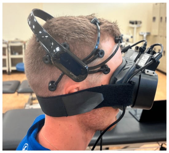 All testing was performed in the same isolated room where sound, temperature, and light were controlled and remained constant with minimal electrical interference. The light was dimmed during testing to prevent light from influencing the pupillometry data. This controlled environment should have optimized the acquisition of EEG and pupillometry data. Each subject was seated, and the Emotiv EPOC+ EEG (Emotiv, San Francisco, CA, USA) was placed using the international 10–20 system of electrode placement (Figure 1) [45]. A saline solution was used on each EEG electrode to ensure proper connectivity. Following this, the Micromedical pupillometer (Micromedical Technologies, Inc., Chatham, IL, USA) was placed with the strap around the lowest part of the occiput to ensure that it would not interfere with the EEG electrodes (Figure 1). The device created a completely dark environment for the subject. This was confirmed by subjects prior to data collection. This dark environment maximizes the ability to capture the true autonomic response to the intervention. The validity and reliability of the Emotiv EPOPC+ and the Micromedical pupillometry devices have previously been demonstrated [19,27,28,32,33,34].