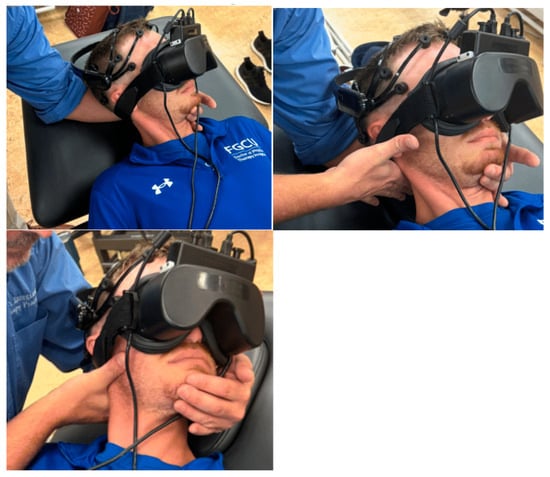 Setup for the atlantoaxial long-axis thrust manipulation with the subject wearing the EEG and pupillometry device. Upper left: The practitioner positions the subject in a left rotation and right side-bend with a chin tuck. Upper right: The practitioner places the first metacarpophalangeal joint of the manipulating hand on the transverse process of the C1 vertebrate. Lower: Atlantoaxial long-axis thrust manipulation pre-intervention position. A high-velocity, low-amplitude thrust manipulation was performed with a direction of force parallel to the practitioner manipulating the forearm, as seen in the lower image.