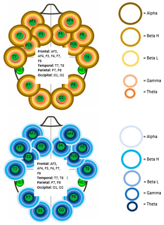 The Friedman test determined that significant changes (p < 0.01) were present in the AS and NAS groups for each of the five brainwave frequency bands (alpha, beta H, beta L, gamma, and theta) at all 14 electrodes of the Emotiv EEG device (5 frequency bands × 14 electrodes = 70 total brainwaves measured). Electrodes were placed based on the brain region (Figure 3) according to the international 10–20 system [45]. Figure 3 displays the visualization of significant brainwave activity changes in both the AS and NAS groups.