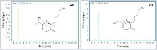 Using the LC-MS-based approach, we captured two small peptides from B. martensii hydrolysates (Figure 1). The peaks m/z 235.1654 ([M + NH4]+, 2.72 min) and m/z 204.1228 ([M + H]+, 3.03 min) were retrieved from the SwissProt database using the Mascot search engine and identified as Ala-Lys (AK) and Gly-Lys (GK), respectively. Subsequent MS/MS analyses revealed that AK produced the main fragment ion at m/z 118 (Lys—COOH), while GK generated the high intensity fragment ion at m/z 145 (Lys). Our findings were further confirmed by comparing their retention times with those of the reference substances in the LC-MS analysis (Figures S1 and S2).