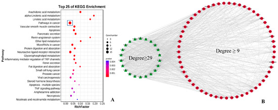 KEGG analysis (A) and core target prediction (B) for AK and GK. Targets were classified based on the “Degree” score: the green triangle nodes (Degree ≥ 29) and the red circular nodes (9 ≤ Degree < 29).