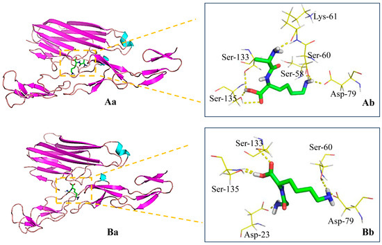 Molecular docking analysis of AK (A) and GK (B). Docked poses (a) and H-bonding interactions (b) between the peptides and macromolecules.