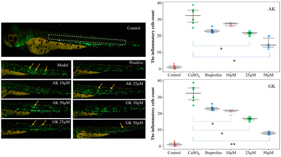 The in vivo activities of AK and GK were assessed in Tg (zlyz:EGFP) transgenic zebrafish as previously described [16]. Zebrafish larvae (3 dpf) were placed in 6-well plates and treated with AK or GK at concentrations of 10, 25, and 50 μM, followed by incubation with 20 μM CuSO4. The effects of the small peptides on inflammation were assessed using a fluorescence microscope (SZX16, Olympus, Tokyo, Japan) to count the number of inflammatory cells migrating towards the zebrafish lateral line.