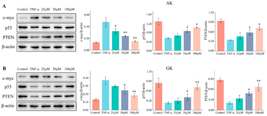 Effects of AK (A) and GK (B) on c-myc, p53, and PTEN protein expression levels. (* p < 0.05, ** p < 0.01 versus the TNF-α group).