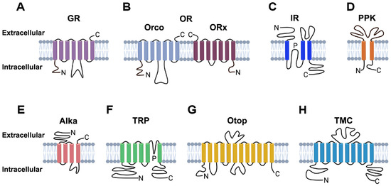 Transmembrane topologies of different families of chemosensory and mechanosensory receptors in the fruit fly, Drosophila melanogaster. (A) Gustatory receptor (GR); (B) Olfactory receptor (OR) complex, consisting of an ORx and the coreceptor Orco; (C) Ionotropic receptor (IR); (D) Pickpocket (PPK); (E) Alkaliphile (Alka); (F) Transient receptor potential (TRP); (G) Otopetrin (Otop); and (H) Transmembrane channel-like (TMC). N represents the amino terminus, C represents the carboxyl terminus, and P indicates the pore loop.
