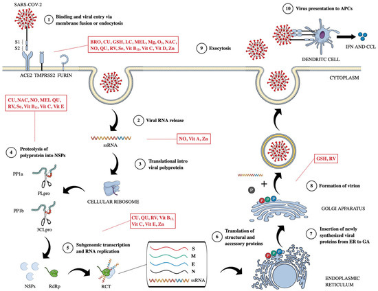 | Se | ↓ cytokine storm (CRP, TNF-α, IL-1, and IL-6) by inhibiting NF-κB activity and upregulating NRF-2 signaling ↑ NK, T, and B cell activity by upregulation of IL-2 receptor ↓ ROS and RNS by modulating GPx and TrxR activity ↓ thrombosis, inhibiting NF-κB | ↓ viral entry by reducing the binding of ACE2 through the interference of viral proteins’ sulfhydryl groups ↓ viral replication, inactivating 3CLPro and PLpro |