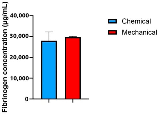Concentration of fibrinogen measured from FD-HPL prepared using chemical and mechanical methods. Both methods yielded similar fibrinogen levels. Values are expressed as the mean ± SEM (n = 3).