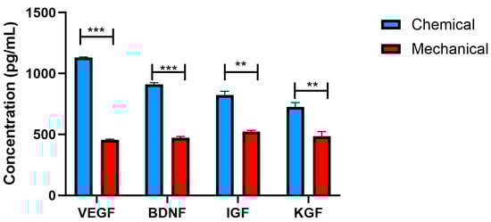 Concentrations of VEGF, BDNF, IGF, and KGF in FD-HPL prepared using calcium salt and mechanical methods. The bar graphs illustrate significant differences in growth factor concentrations between the two preparation methods. Values are expressed as the mean ± SEM (n = 3). Statistical significance is indicated as ** p < 0.01 and *** p < 0.001.