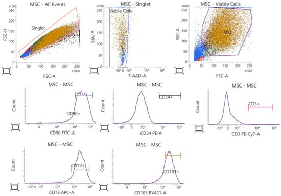 To characterize the surface markers of the cell population, flow cytometry was performed using a BD Biosciences flow cytometer (BD Biosciences, Franklin Lakes, NJ, USA). UC-MSC cell cultures were harvested, washed with phosphate-buffered saline (PBS), and then resuspended in PBS containing 2% fetal bovine serum (FBS) to block non-specific binding. Approximately 1 × 105 cells were incubated with the following antibodies: anti-CD73, anti-CD90, anti-CD105, anti-CD34, and anti-CD3. Cells were incubated with the antibodies at 4 °C for 30 min in the dark. After incubation, the cells were washed twice with PBS containing 2% FBS and resuspended in PBS for analysis. Fluorescence data were collected using the flow cytometer, and the expression of CD markers was analyzed with BD FACSDiva software v. 6.1.3 (BD Biosciences, Franklin Lakes, NJ, USA). All the flow cytometry antibodies used were procured from BD Biosciences, USA. Each experiment was performed in triplicate, and data are presented as mean ± SEM.