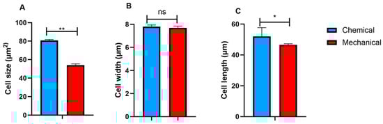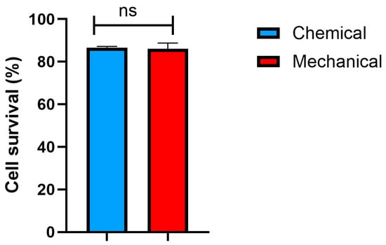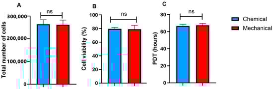 There were no statistically significant differences between chemical and mechanical treatments across all measured parameters, suggesting comparable efficacy of both methods in maintaining cell number (A), viability (B), and growth rate (C). Data are presented as mean ± SEM (n = 3). ns: not significant.